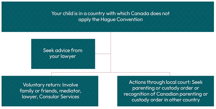 This checklist assumes that your child has been, or is suspected of having been, abducted to a country that is not party to the Hague Convention. If the country is party to the Hague Convention, one of your first steps should be to contact your provincial or territorial Central Authority. For a list of states that are party to the Convention, visit hcch.net.